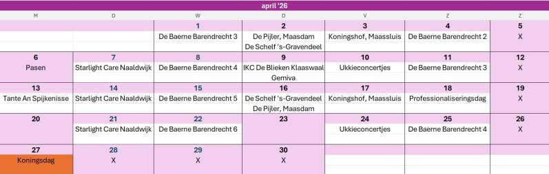 - Muziek op Schoot babycursus maandag 10:00-10:45 uur (6 lessen) - lesdata: 12-5-2025, 26-5-2025, 2-6-2025, 16-6-2025, 23-6-2025 en 7-7-2025 in Oud-Beijerland.